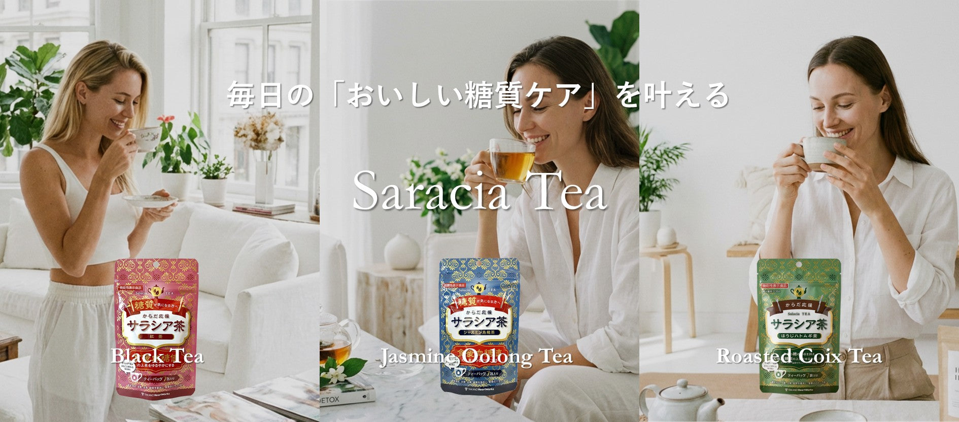 機能性表示食品〈からだ応援サラシア茶〉シリーズ(紅茶/ジャスミン烏龍茶/ほうじハトムギ茶)の取扱いを開始しました。