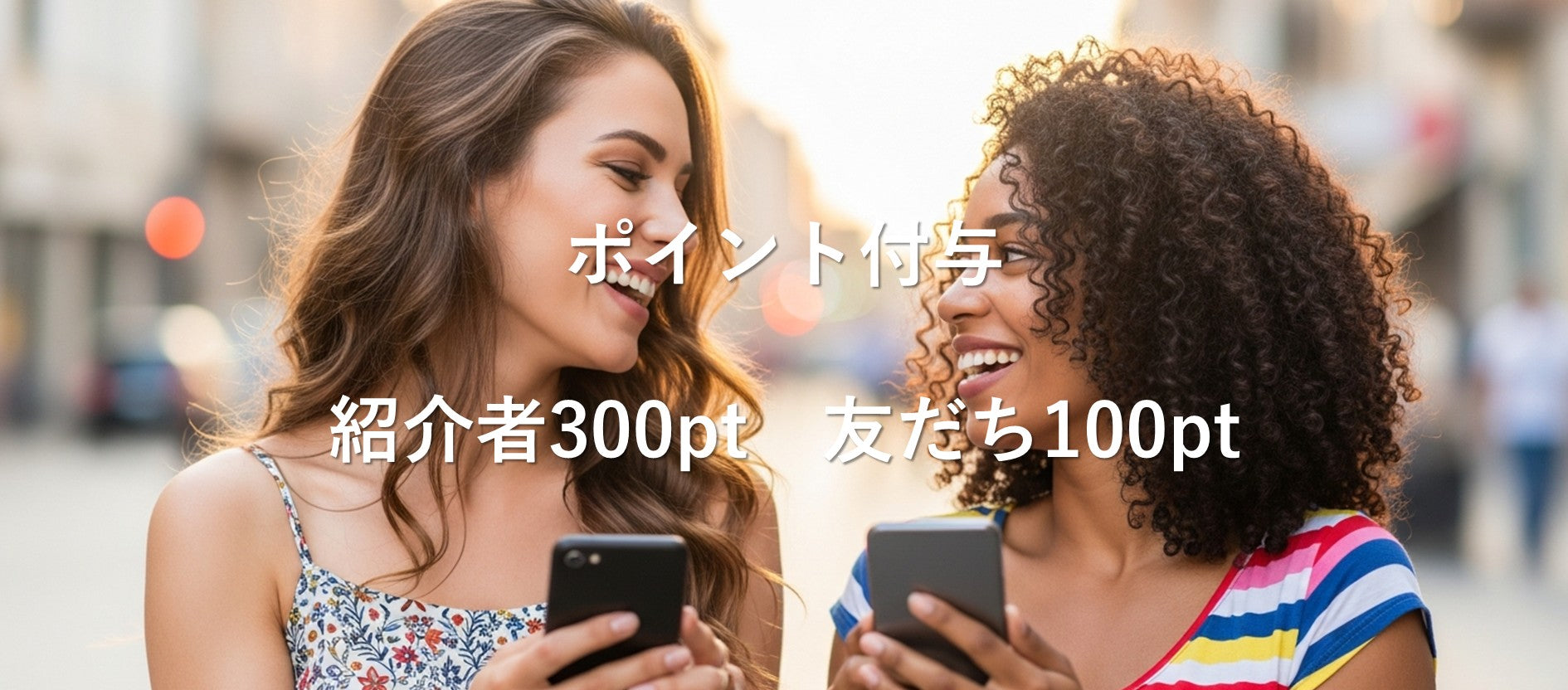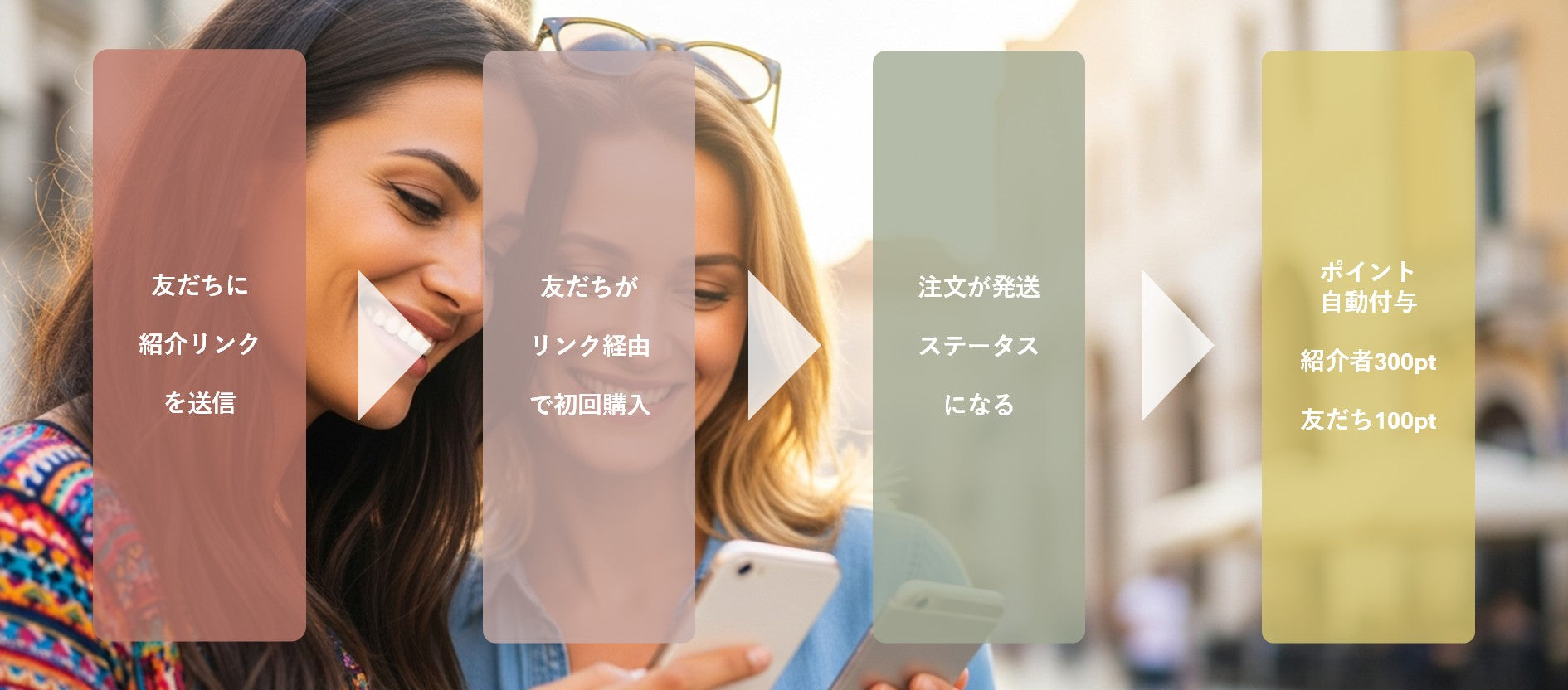 あなたの専用リンクを友だちにシェアし、友だちが初回購入を完了すると・あなたに 300ポイント・友だちに 100ポイントが自動で付与されます。ぜひ一緒におトクを広めましょう!