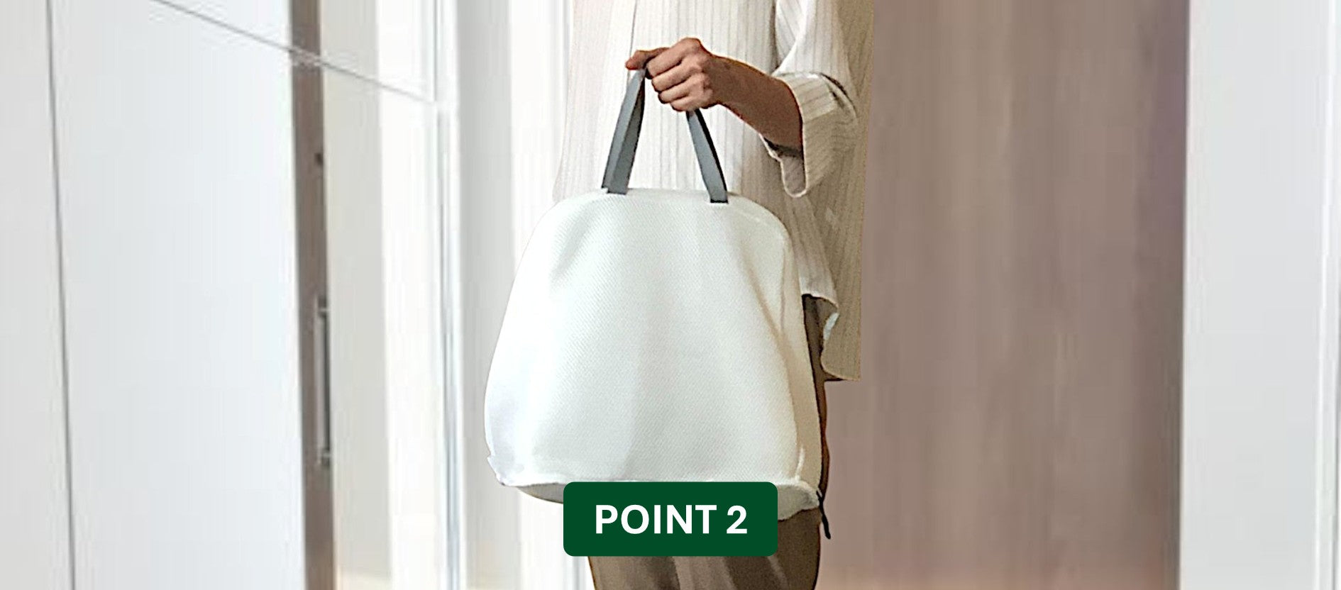 ・ バッグ内を6割以下に保つことで、より早く均一に乾燥します。厚手タオル・ニット・デニムなど乾きにくい素材はバッグ外での乾燥を推奨します。