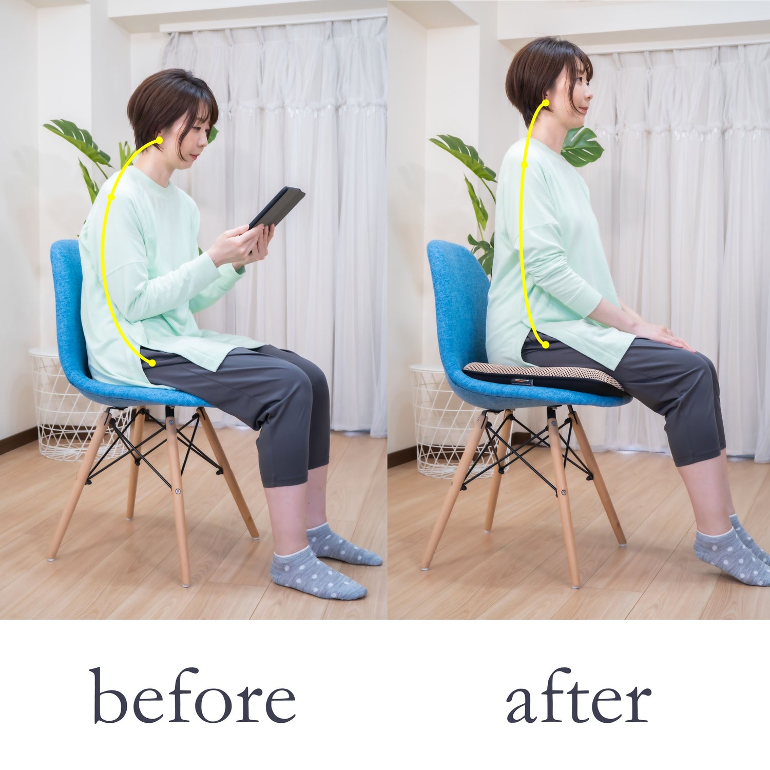クッションを使用すると、体圧が分散されて骨盤やお尻への負担が軽減されます。また、正しい座り姿勢をサポートしやすくなり、長時間でも快適に過ごしやすくなります。座り心地が向上することで、集中力の維持や作業効率のアップも期待できます。
