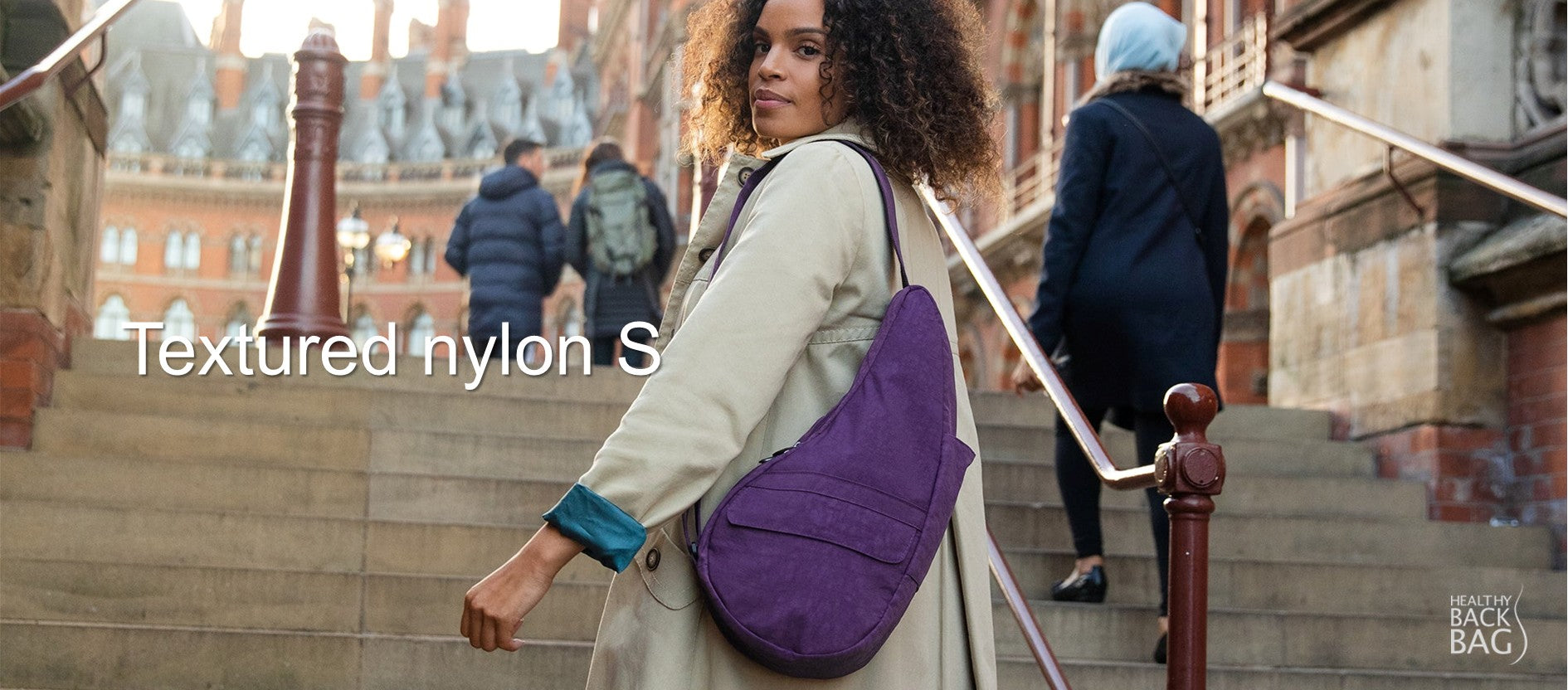 背中にぴたり、荷物はふわり――「ヘルシーバックバッグ S テクスチャードナイロン アメジスト」は〈しずく型×12ポケット〉で“軽さ”を体感できる人間工学ショルダーバッグです。