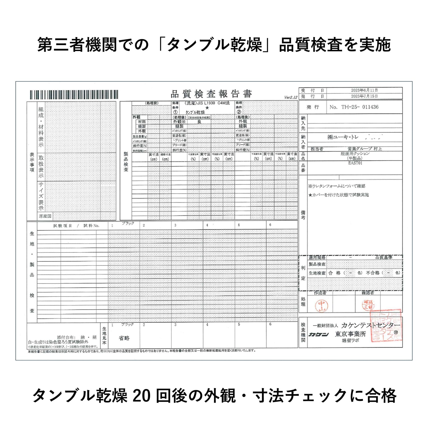 クッション内部のウレタンフォームは、カバーを装着したままタンブル乾燥(60 ℃)20 回を含む耐久試験を実施。
