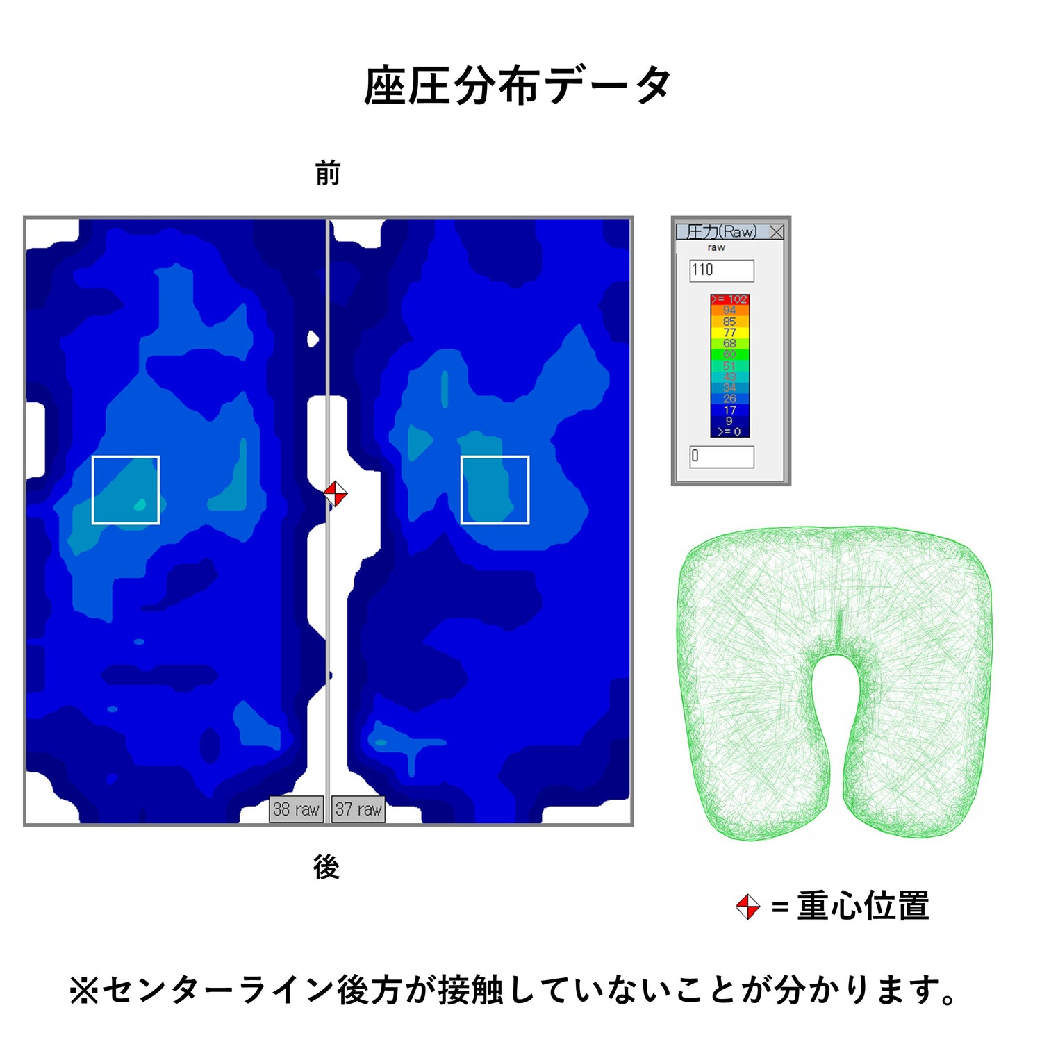 円座の課題であった圧力集中は、U字の人間工学形状が体圧を広範囲に分散し、快適性と姿勢サポートを実現します。