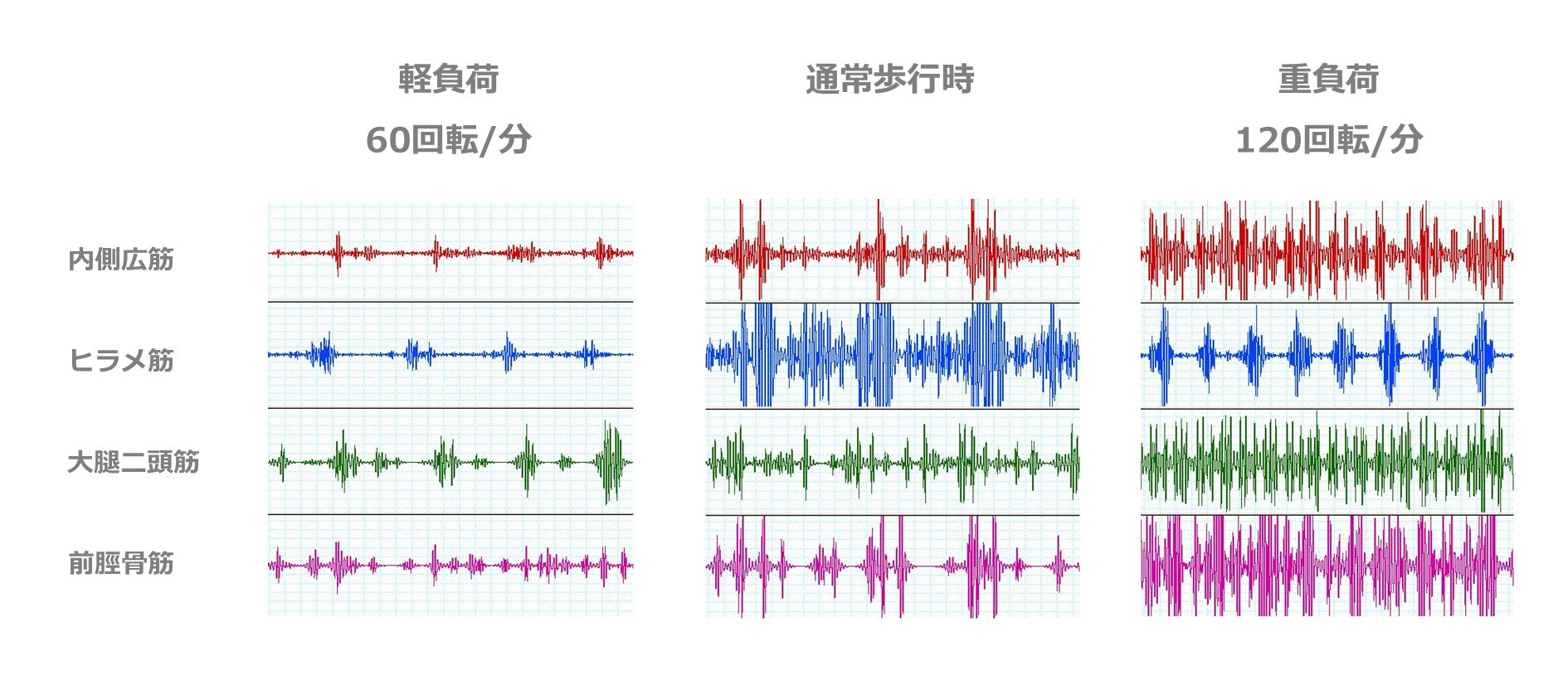 高めの負荷設定で使用した場合、通常の歩行時よりも多くの筋活動が認められました。