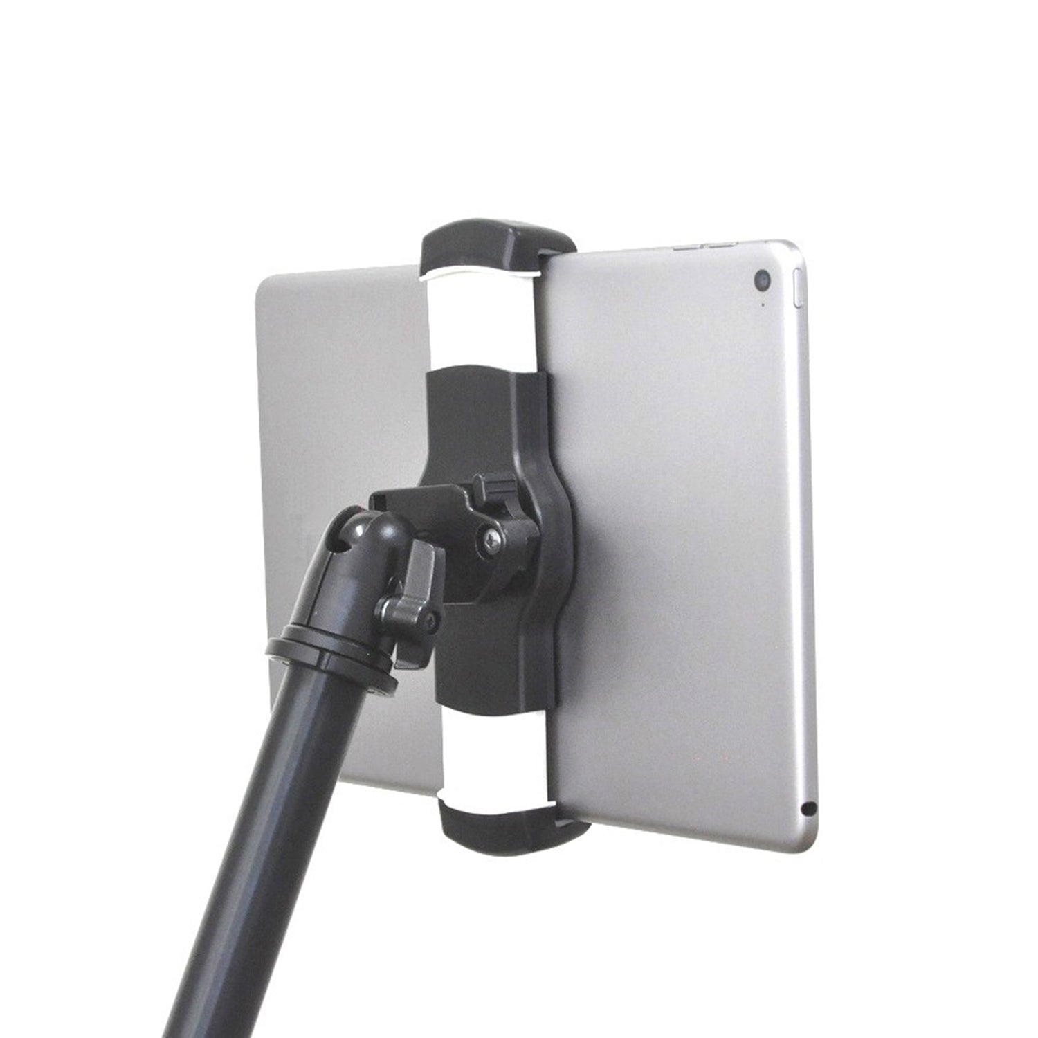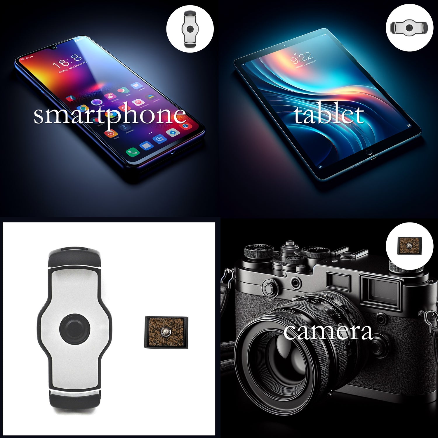 スマートフォンやタブレットをしっかり固定できるホルダーと、カメラ取付用のアタッチメントが付属しています。さまざまな端末や機器の設置に柔軟に対応できます。